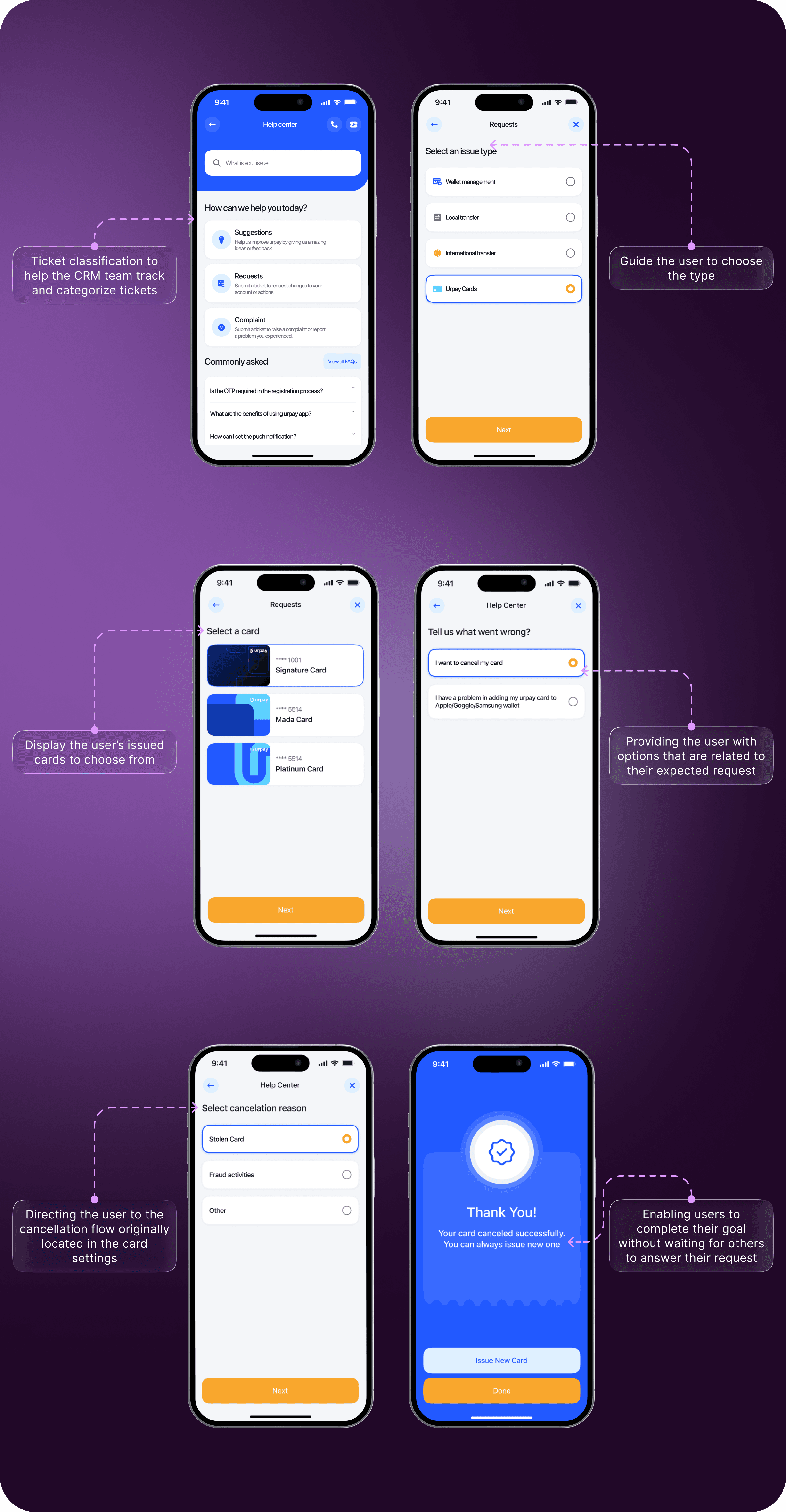 Rdesigning the Help Center experience to reduce CRM ticket volume while empowering users to resolve common issues independently. The solution introduces clear support classifications and action-driven self-service journeys, allowing users to complete critical tasks—such as card cancellation due to fraud—without raising a ticket or contacting an agent. The approach balances user needs with operational efficiency, improving both the customer experience and CRM workflow effectiveness.
