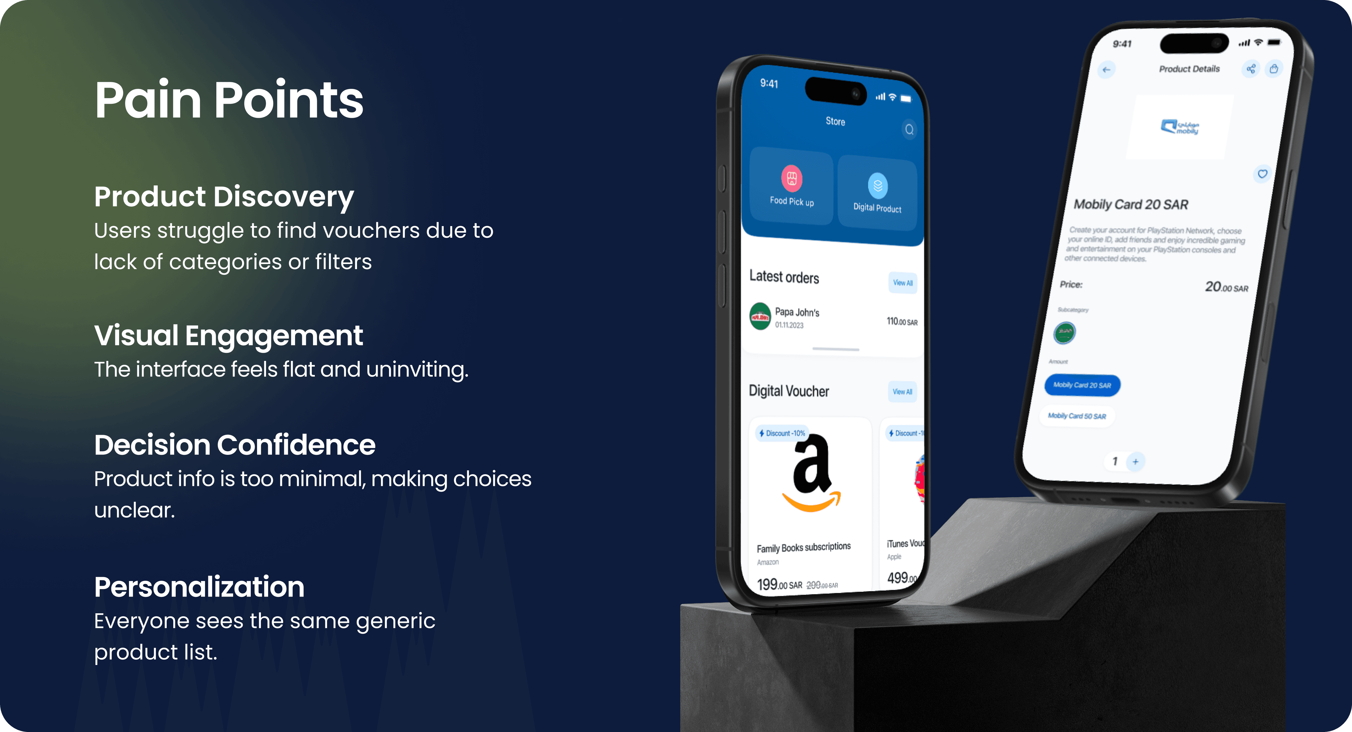 Although urpay’s digital store offered voucher products, users often struggled to find relevant items or navigate easily due to a lack of structure and discovery features. As a result, users missed opportunities to engage with the store, leading to lower satisfaction and fewer completed purchases. While revamping the experience, I was also tasked with designing for future physical product integration, ensuring the new flows could support both digital and physical purchases without disrupting the simplicity and clarity of the digital-first experience.