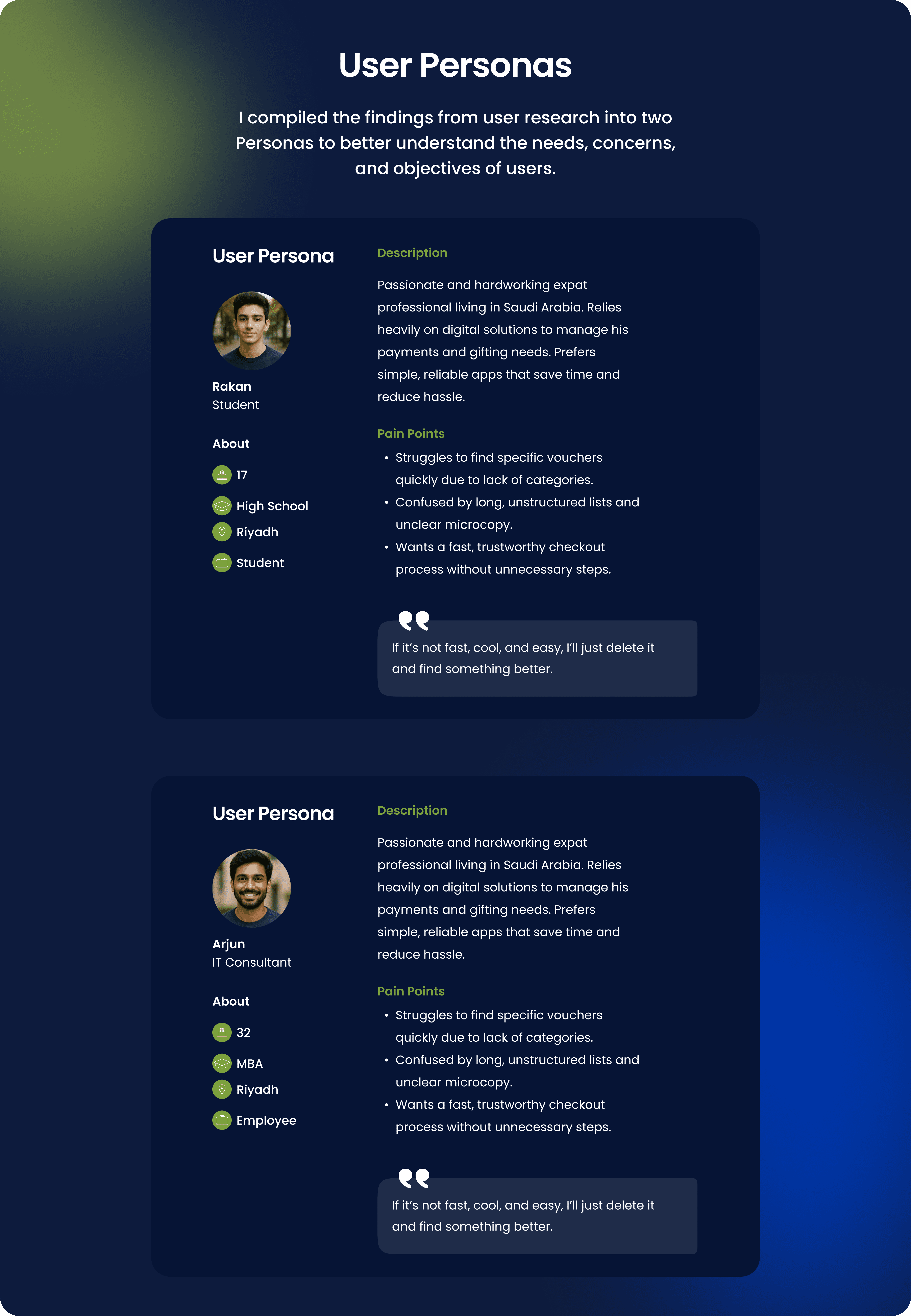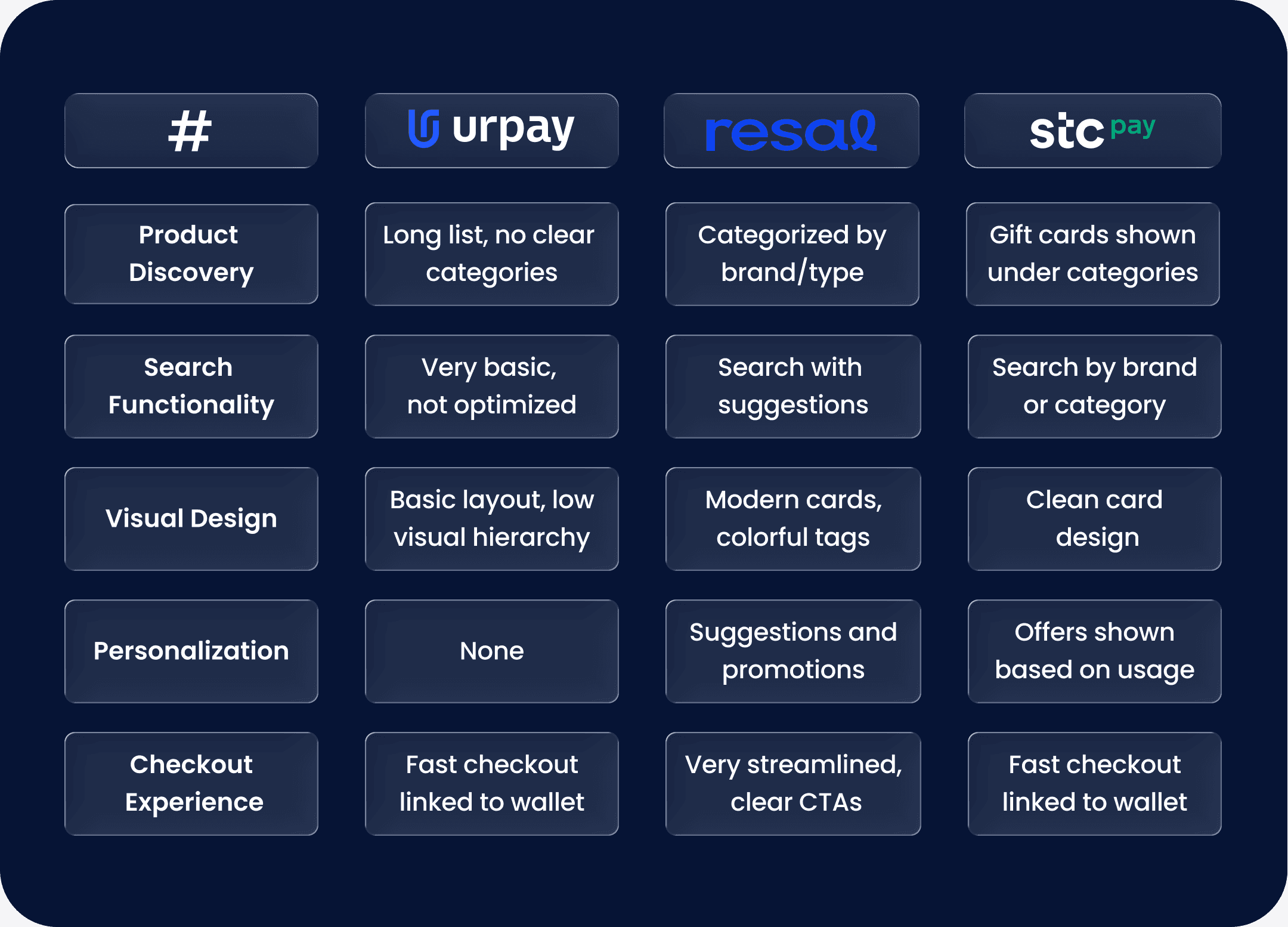To identify areas for improvement in urpay's digital store, I conducted a benchmarking analysis against prominent Saudi Arabian voucher and gift card platforms: